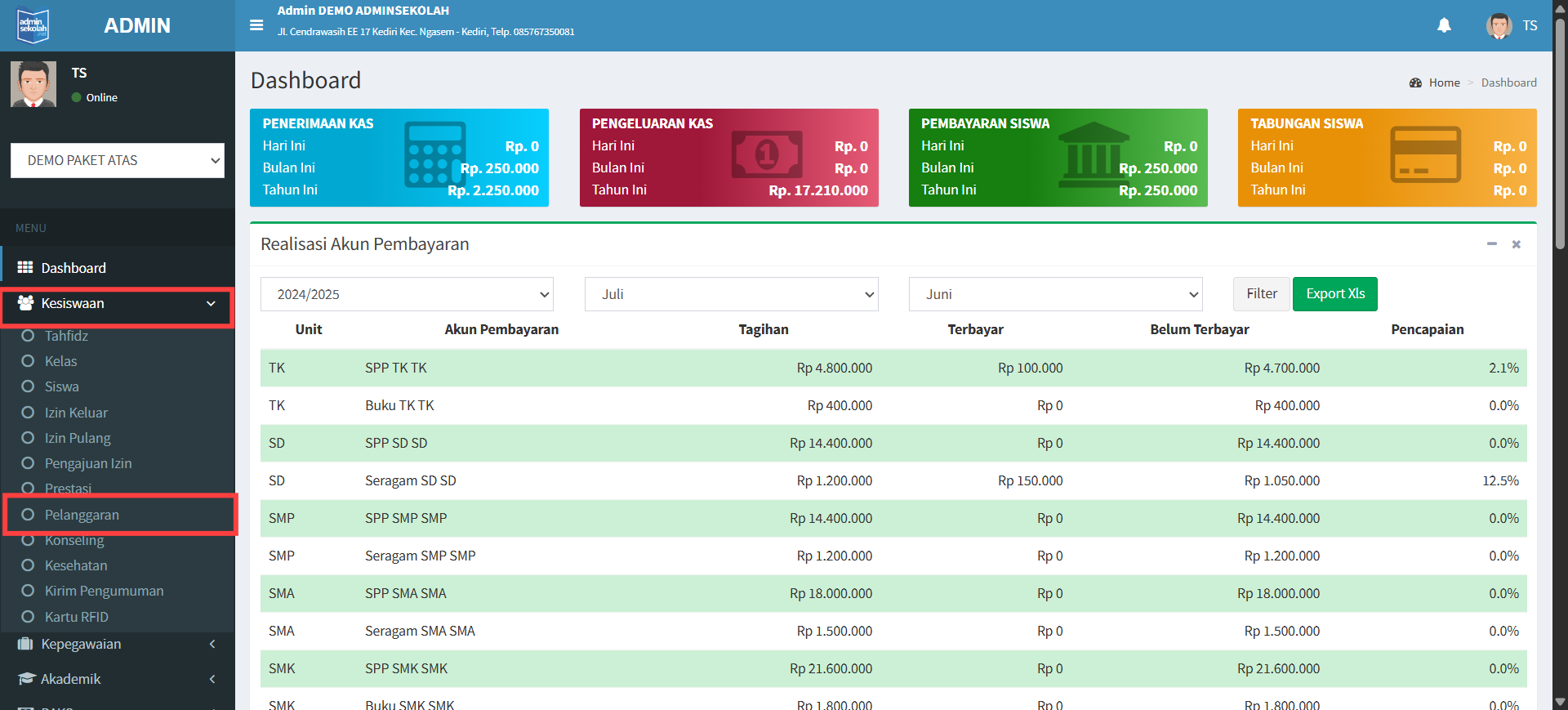 1. Masuk ke menu [Kesiswaan] -> pilih [Pelanggaran]