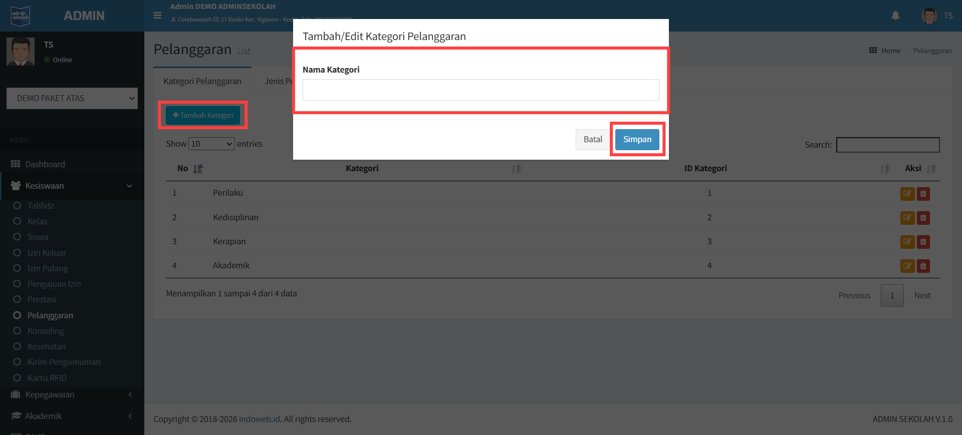 3. Silahkan isi Kategori Pelanggaran dengan cara Klik [Tambah Kategori] -> Masukkan Nama Kategori Pelanggaran -> Klik Simpan