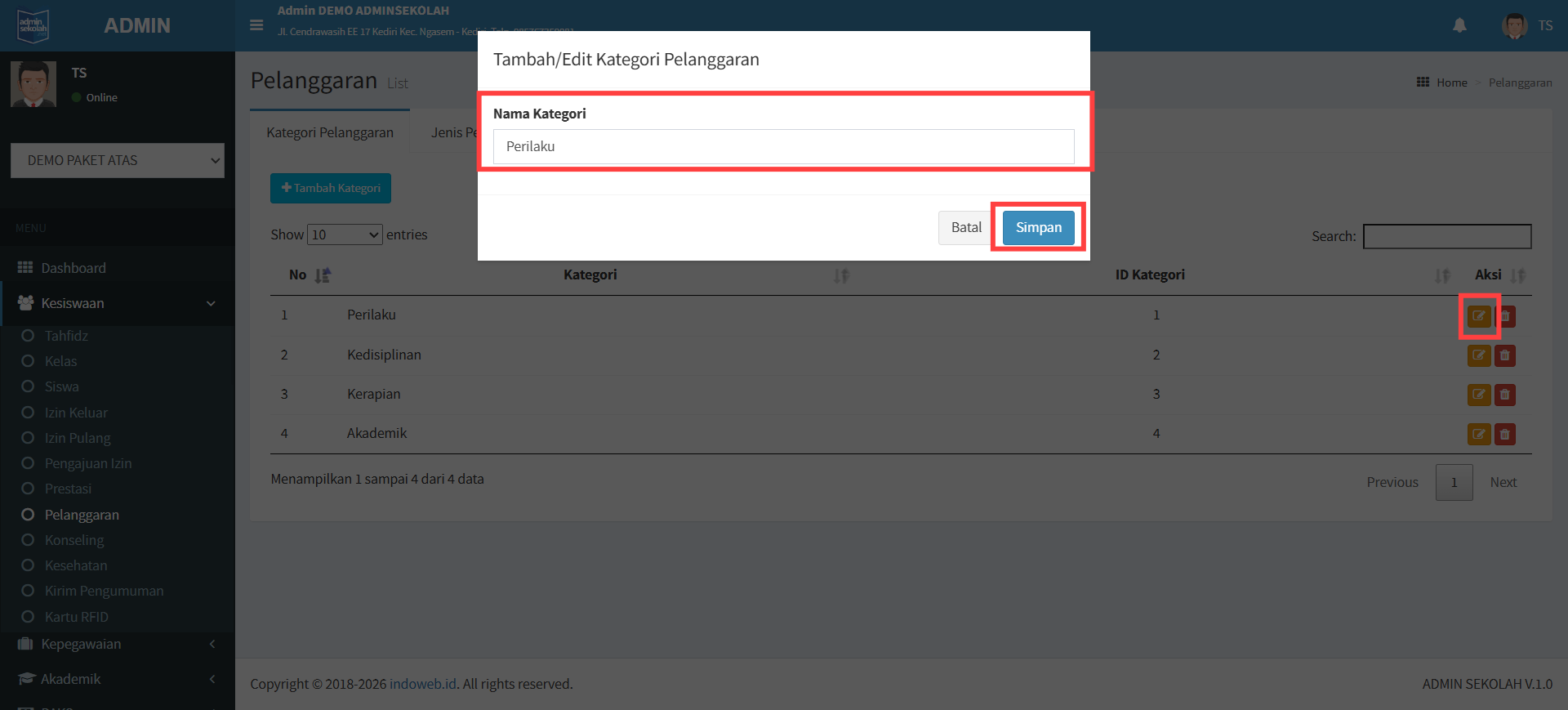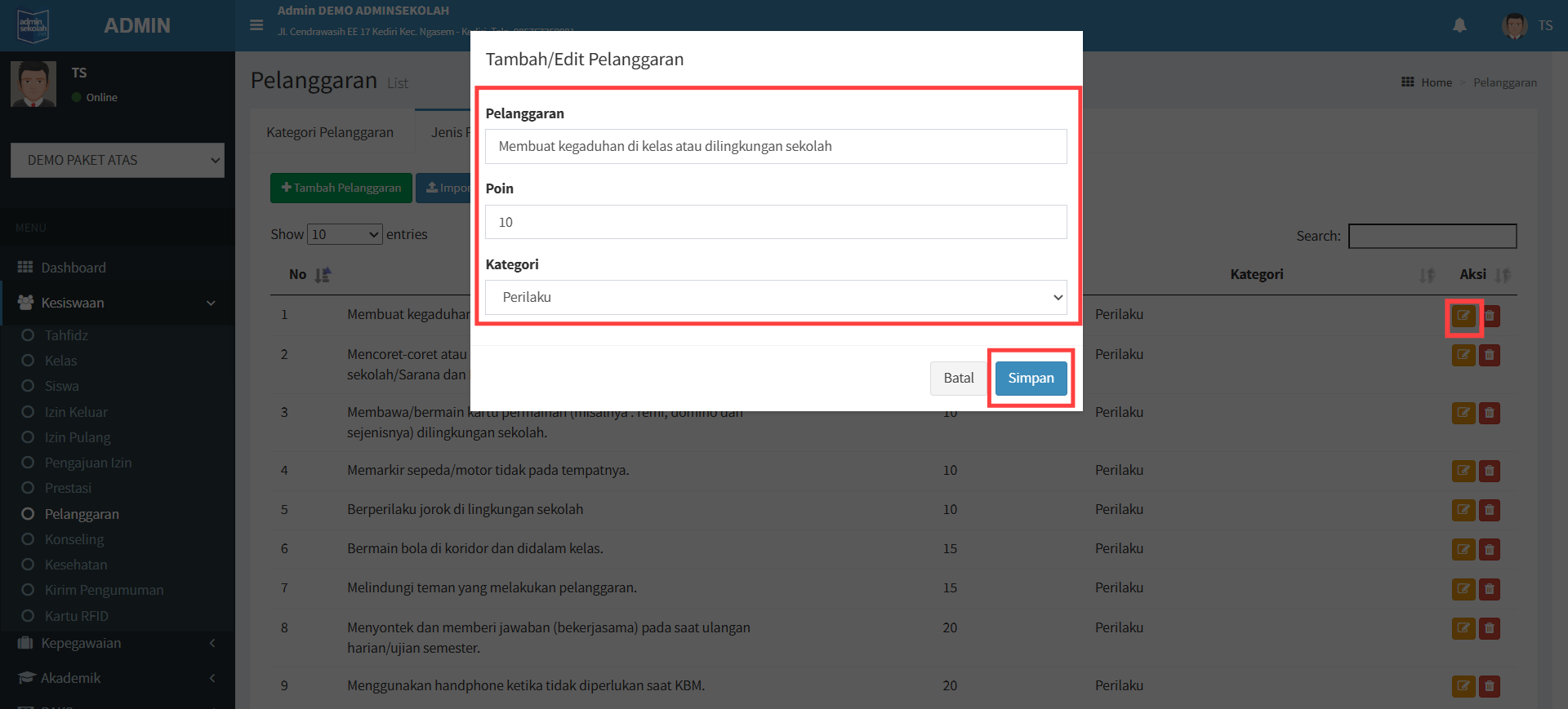 7. Edit Prestasi Klik Tombol Edit -> Ubah / Tidak Nama Pelanggaran dan Poin -> Ubah / Tidak Mengubah Kategori -> Klik Simpan.