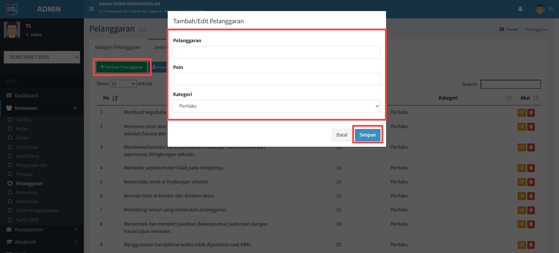 6. Menambah Prestasi Klik Tambah Pelanggaran -> Pilih Kategori Pelanggaran -> Isi Nama Pelanggaran dan Poin Pelanggaran -> Klik Simpan.