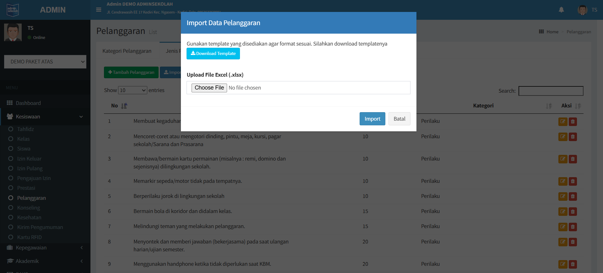 8. Import Data Pelanggaran yaitu dengan cara Klik Tombol Import Pelanggaran -> Muncul Pop Up Import Data Pelanggaran -> Download Template -> Isikan semua pelanggaran di template yang sudah di download -> Upload template yang sudah di isi.