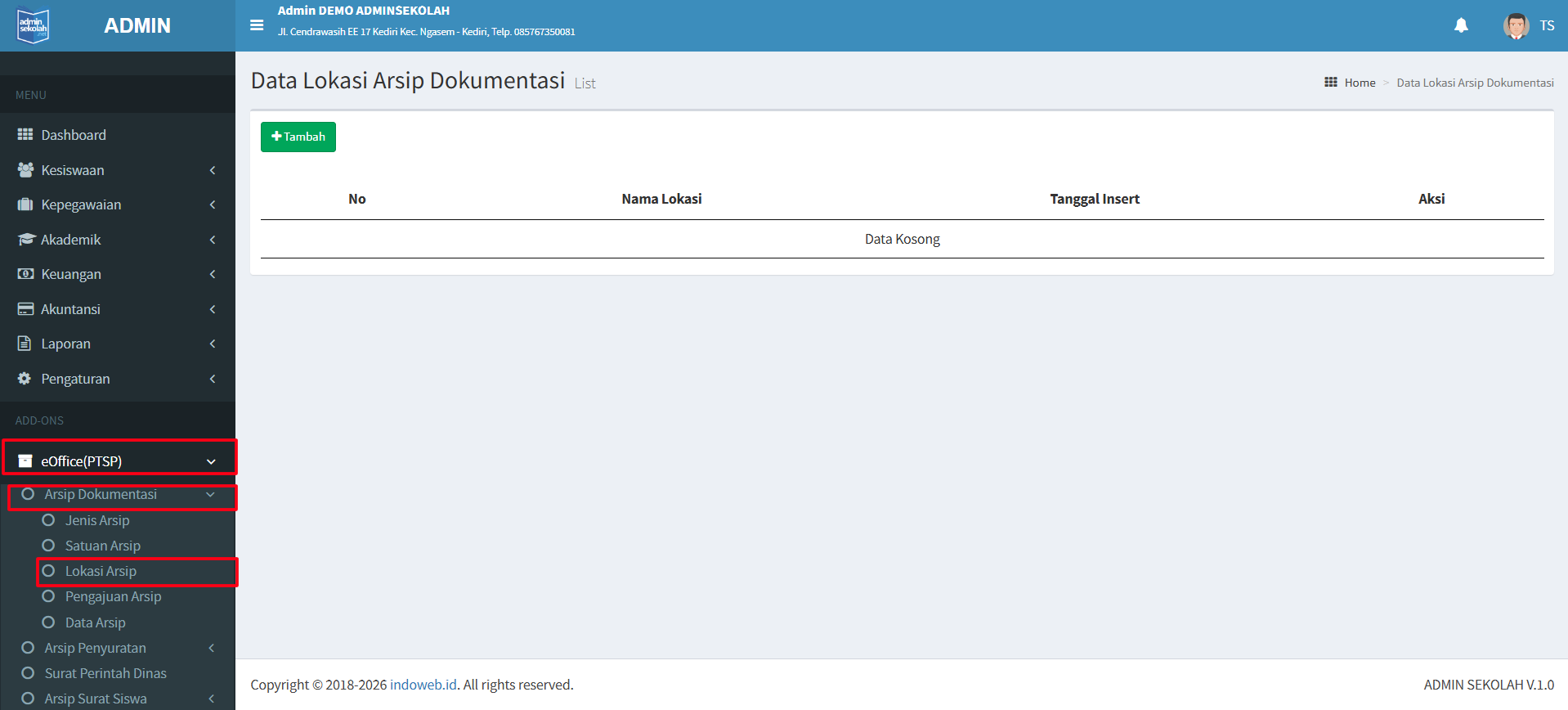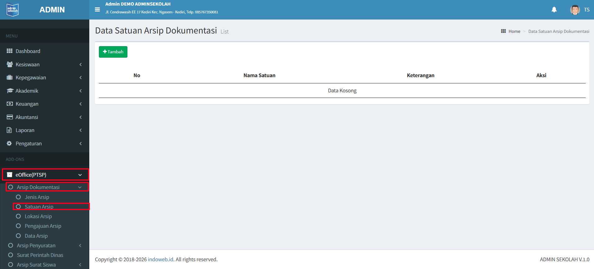 Aplikasi Admin Sekolah dilengkapi dengan Add-Ons eOffice (PTSP). Add-Ons ini digunakan untuk manage surat menyurat. Pada Add-Ons PTSP ini terdapat beberapa menu antara lain Arsip Dokumentasi. Berikut beberapa menu di menu Arsip Dokumentasi pada Add-Ons di PTSP :