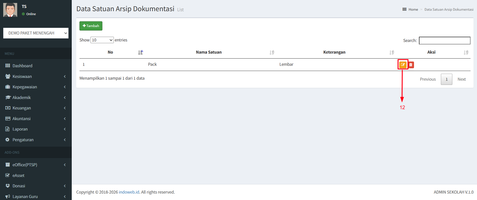 12. Apabila ingin mengubah nama Satuan Arsip dan Keterangannya silahkan klik tombol Edit.