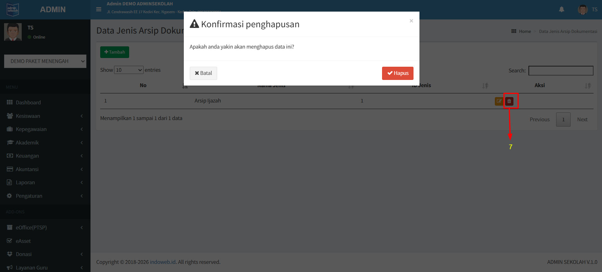 7. Apabila ingin menghapus data silahkan klik tombol Hapus dan akan muncul notifikasi konfirmasi penghapusan.