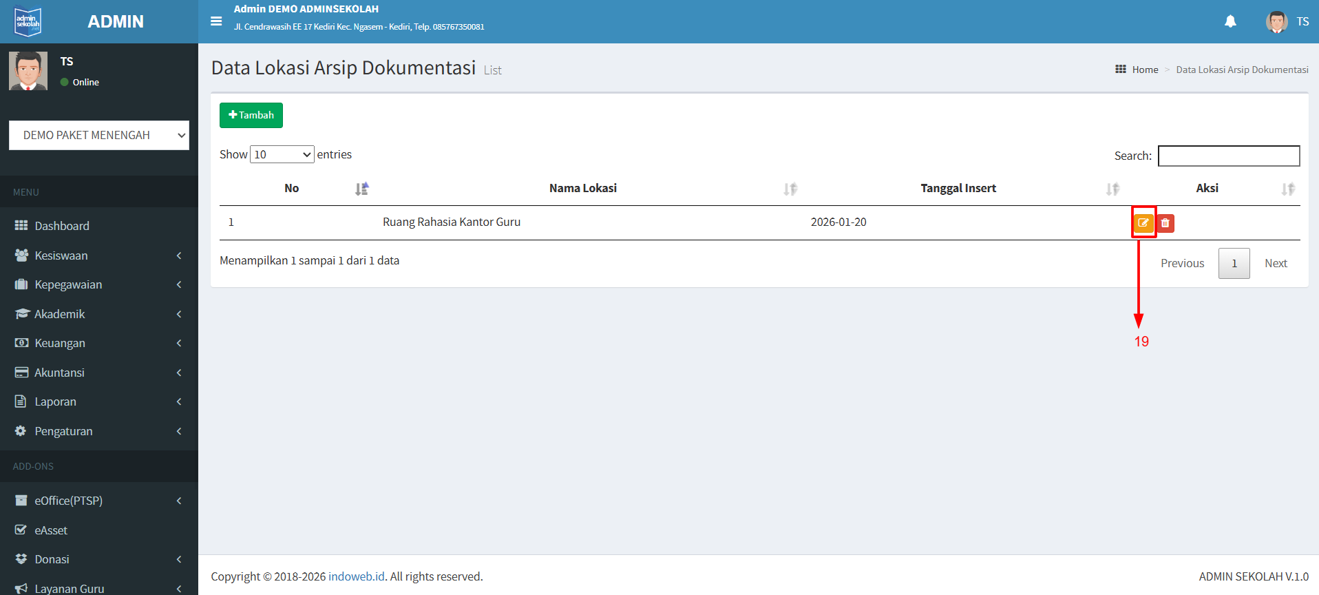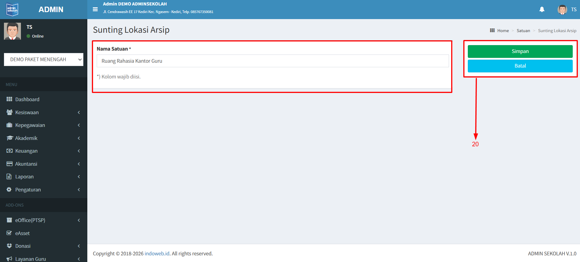 20. Setelah klik tombol Edit maka anda akan diarahkan ke halaman Edit. Dan silahkan ubah nama Lokasi Arsip lalu klik Simpan. Apabila perubahan nama dibatalkan bisa klik Batal.