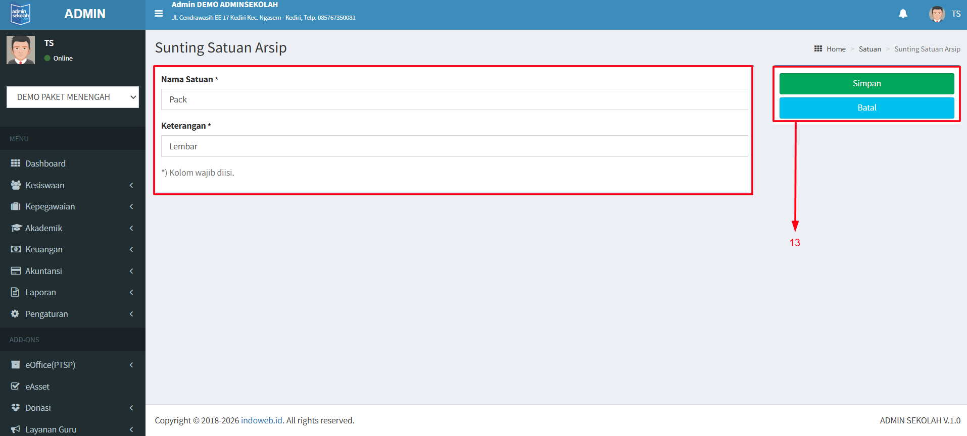 13. Setelah klik tombol Edit maka anda akan diarahkan ke halaman Edit. Dan silahkan ubah nama Satuan Arsip dan Keterangan lalu klik Simpan. Apabila perubahan nama dibatalkan bisa klik Batal.