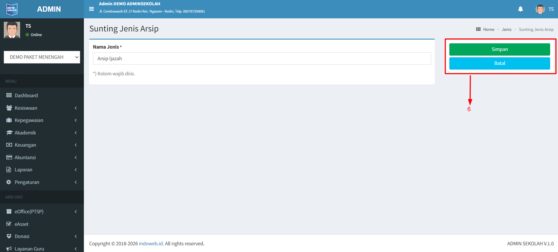 6. Setelah klik tombol edit maka anda akan diarahkan ke halaman edit. Dan silahkan ubah nama jenis arsip lalu klik Simpan. Apabila perubahan nama dibatalkan bisa klik Batal.