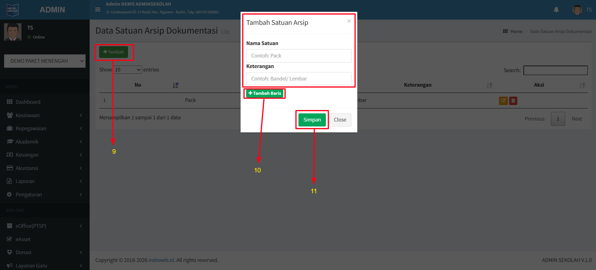 Menu Satuan Arsip digunakan untuk memasukkan data satuan dari data arsip yang dimasukkan. Berikut tutorial penggunaan menu Satuan Arsip.