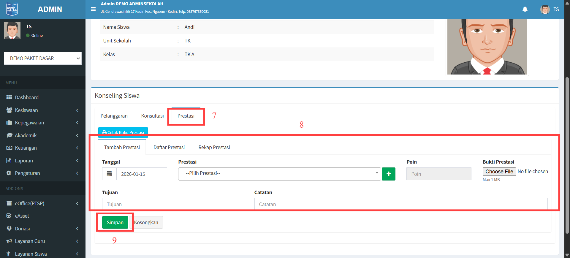 Update terbaru untuk menu Konseling terbagi jadi 3 kategori yaitu Pelanggaran, Konseling, dan Prestasi. Sekarang kita coba tambah data konseling untuk Kategori Prestasi. Berikut tutorial “Cara Tambah Konseling Siswa Kategori Prestasi”: