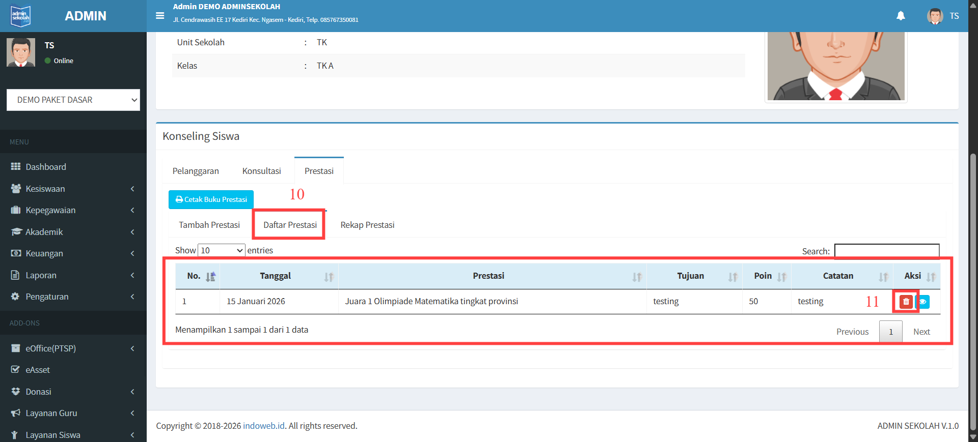 10. Laporan daftar pelanggaran siswa dapat anda lihat dengan cara klik tab [Daftar Prestasi] maka akan tampil daftar prestasi dari siswa tersebut