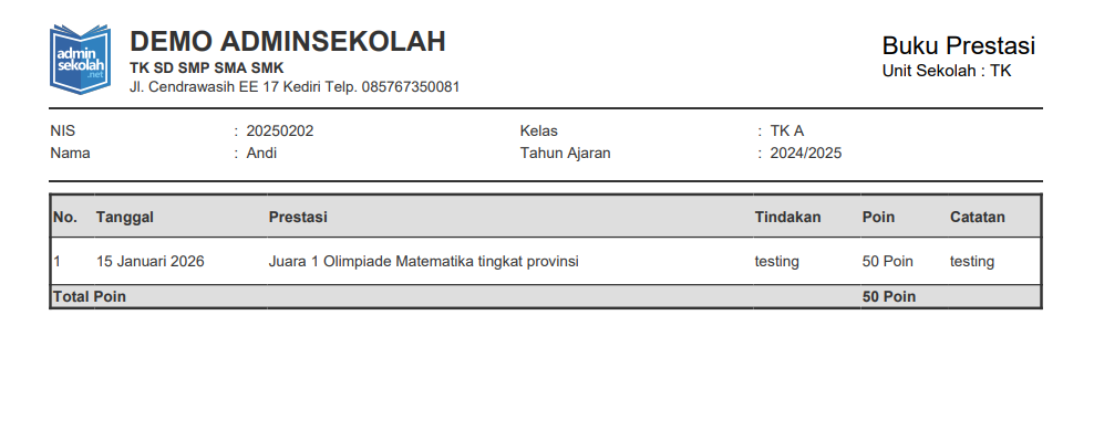 13. Setelah laporan prestasi siswa sudah sesuai, anda dapat mencetak buku prestasi siswa dengan cara klik [Cetak Buku Prestasi]