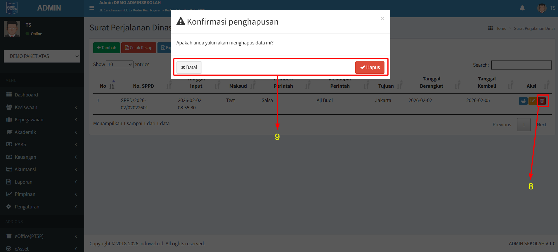 9. Klik Hapus di modal yang muncul apabila ingin menghapus dan klik Batal apabila tidak ingin hapus data.