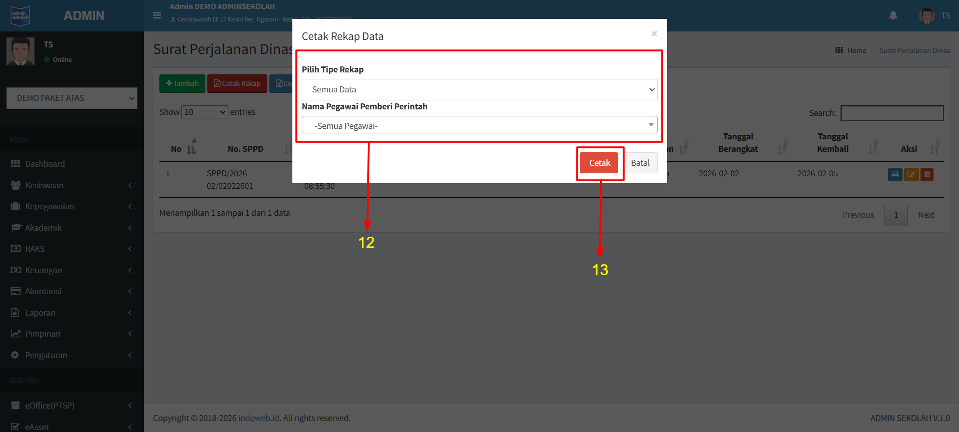 12.Pilih semua data atau per tanggal input serta nama pegawai pemberi perintah.