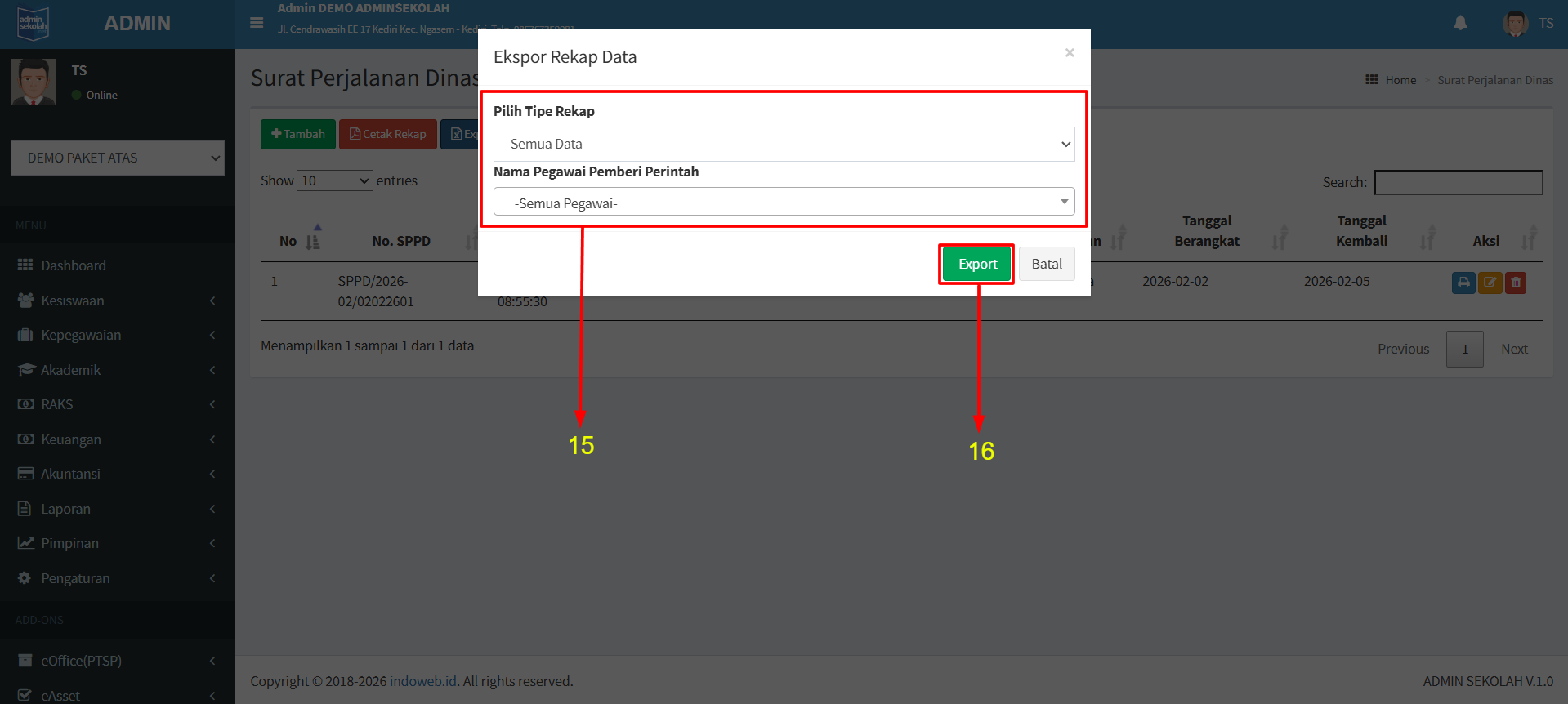 15.Pilih semua data atau per tanggal input serta nama pegawai pemberi perintah.